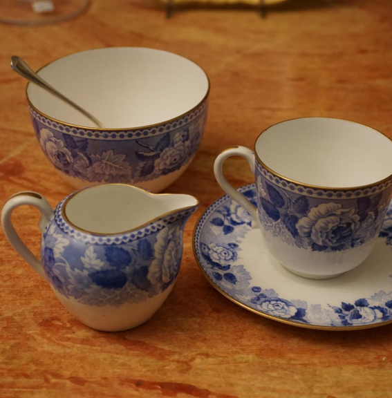 Set in porcellana inglese bianca ed azzurra con bordino in oro zecchino, composto da tazzina con piattino, lattiera e zuccheriera con cucchiaino. Periodo Inghilterra primi 900'. Offerta speciale: 200,00 Euro anzichè 400,00