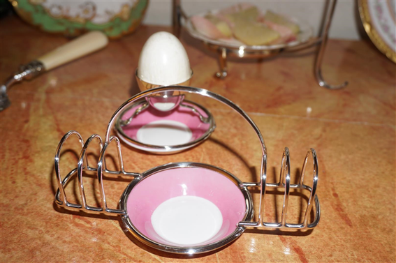 Portauovo e porta pane tostato in old sheffield con burriera in porcellana rosa. Inghilterra primi 900'. Offerta speciale: 280,00 Euro anzichè 550,00 Euro