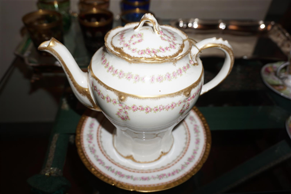 Teiera e relativo piatto in pregiata porcellana di Limoges decorata con oro zecchino.. Periodo 1893, Francia. Offerta speciale: 400,00 Euro anzichè 900,00 Euro