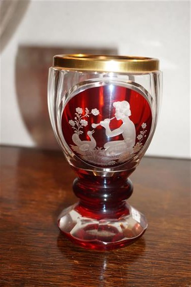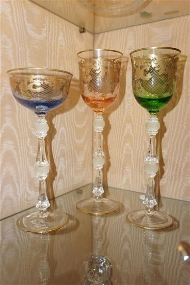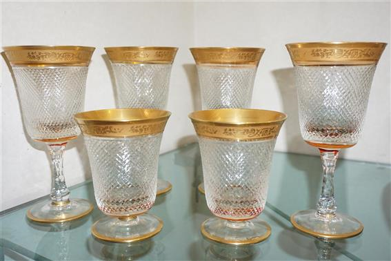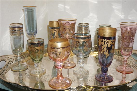 Favoloso set di bicchieri in cristallo inciso colorati con decoro di oro zecchino con vassoio in sheffield d'epoca inglese Offerta speciale: 400,00 Euro anzichè 700,00 Euro