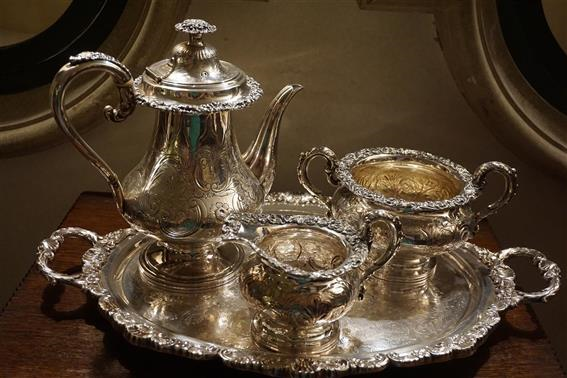 Set di Caffettiera, teiera, lattiera e zuccheriera in argento 800% lavorato completamente a mano. Offerta speciale: 1200,00 Euro anziché 2400,00 Euro