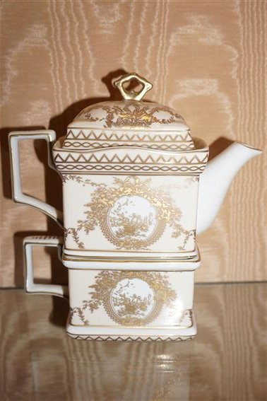 Teiera con tazza rettangolare in porcellana rifinito in oro zecchino con decorazioni oro. Firmato "Royal Family". Offerta speciale: 35,00 Euro anziché 55,00 Euro